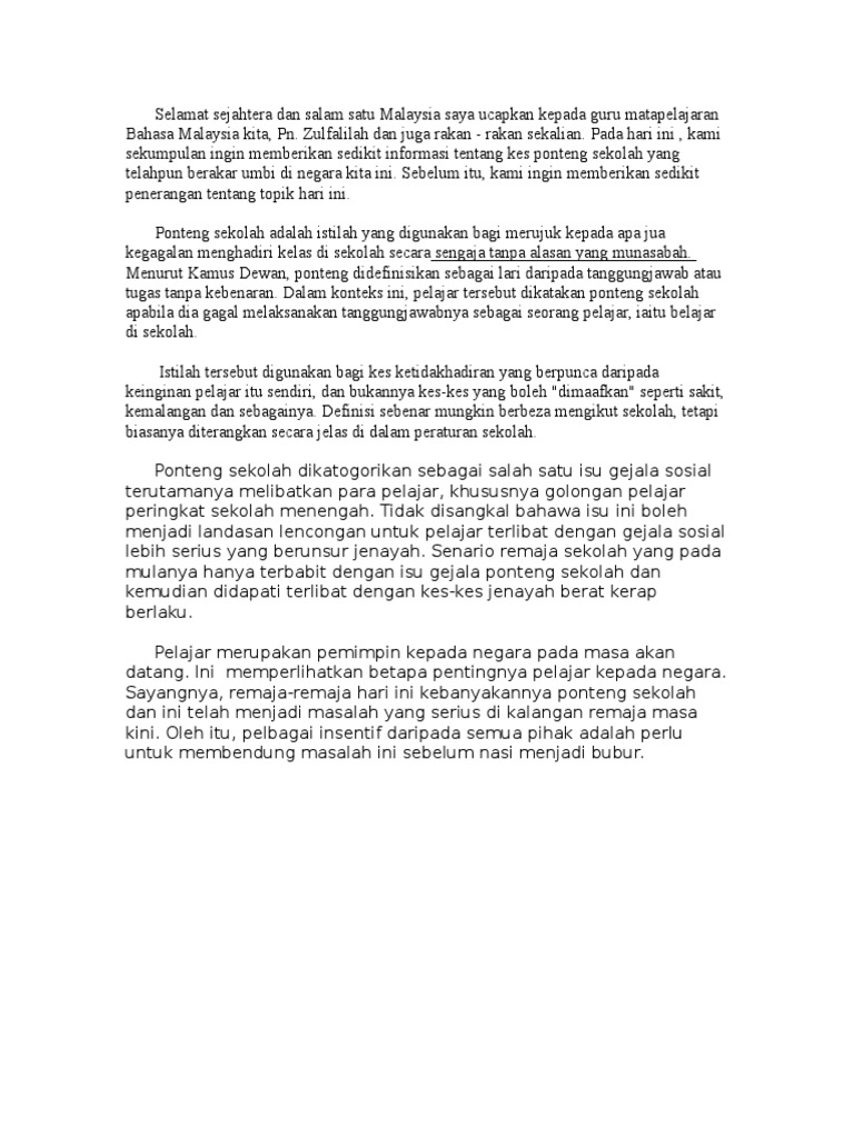 Antara lain ponteng bagaikan satu indikator yang menanda aras kelemahan sistem pendidikan Malaysia yang diimplementasikan melalui Dasar Pendidikan Negara DPN. SEKOLAH merupakan tempat untuk menimba ilmu pengetahuan dan juga merupakan institusi pendidikan masyarakat yang akan membentuk pola budaya generasi akan datang. Karangan - Gejala Ponteng Dalam Kalangan Pelajar Ponteng merupakan kekangan disiplin yang paling banyak berlaku dan sukar diatasi di sekolah.